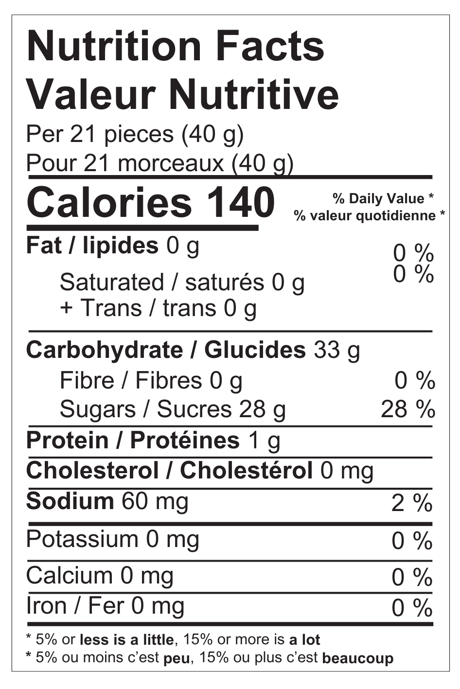 Sirop de maïs, sucre, dextrose, gélatine, amidon alimentaire modifié, eau. Contient 2 % ou moins des ingrédients suivants : acide malique (acide DL-malic), acide citrique, citrate de sodium, concentré de jus de pomme, arômes naturels et artificiels, gomme arabique, cire de carnauba, colorants ajoutés (rouge 40, jaune 5, rouge 40 lac, jaune 5 lac, bleu 2 lac, jaune 6, carmin [colorant], bleu 1, bleu 1 lac), concentré de jus de melon d’eau.