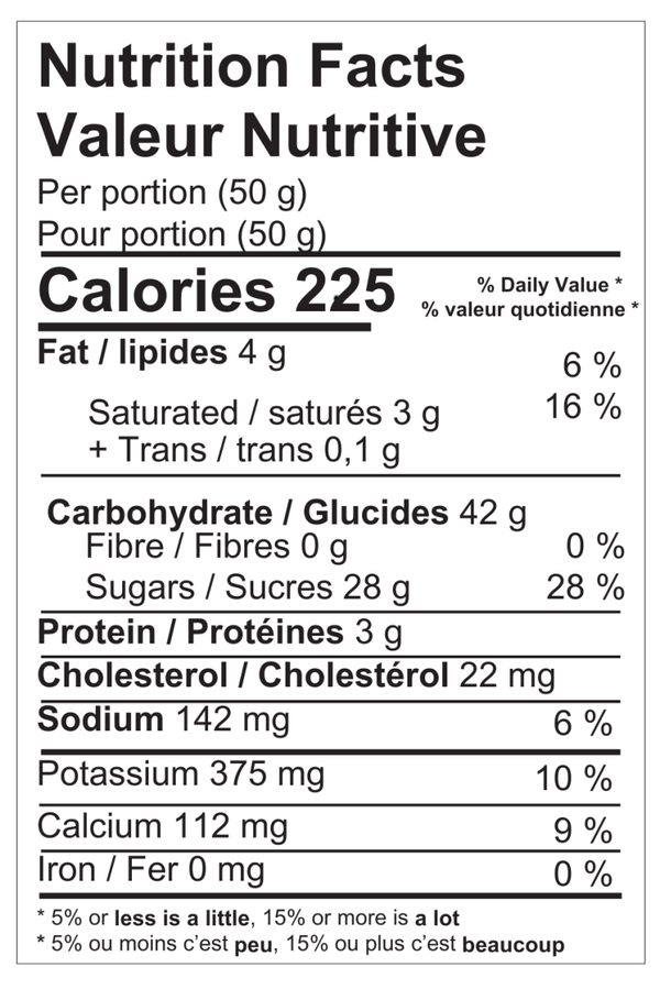 Ingrédients : Substances laitières modifiées (lait), sucres (sucre, glucose), crème, arôme naturel et artificiel, gel de cellulose, mono- et diglycérides, polysorbate 80, gomme de cellulose, gomme de guar, carraghénine.